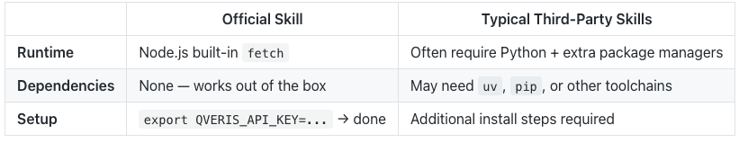 The official skill is designed to expose the full breadth of QVeris's capabilities to your agent: