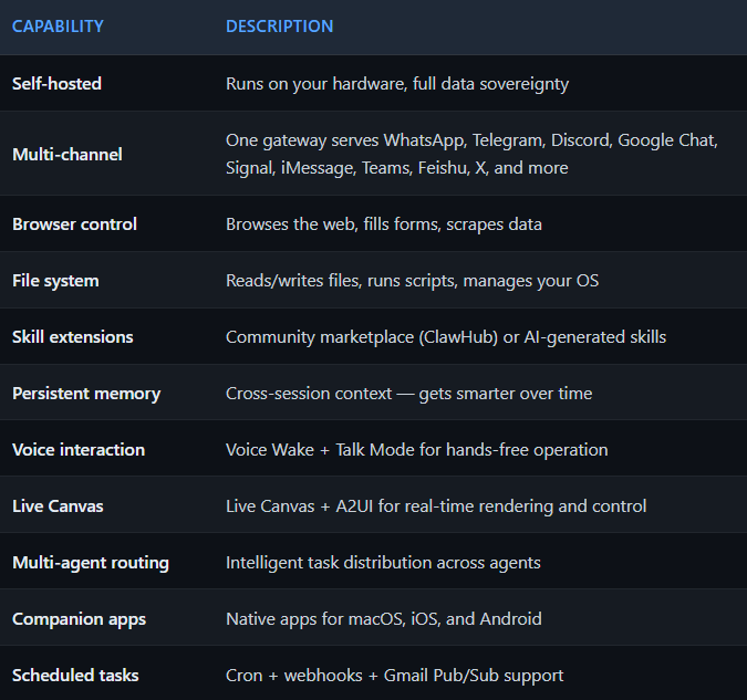 - Multi-channel gateway: One process connects WhatsApp, Telegram, Discord, Slack, Google Chat, Signal, iMessage, BlueBubbles, Microsoft Teams, Matrix, Zalo, Zalo Personal, WebChat, Feishu, X — simultaneously.