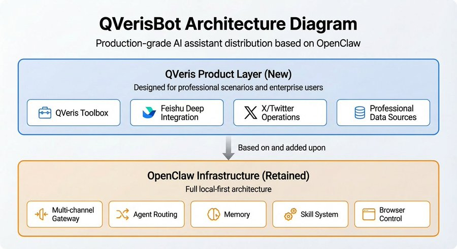 QVerisBot is a production-focused distribution built by the QVeris AI team on top of OpenClaw.It keeps OpenClaw's entire local-first architecture and adds a QVeris-first product layer designed for professional and enterprise use cases: