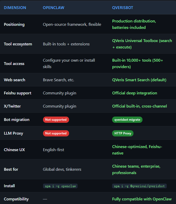 The short version: OpenClaw is the framework; QVerisBot is the product. If you want to deeply customize, choose OpenClaw. If you want a professional AI assistant that works out of the box, choose QVerisBot.
