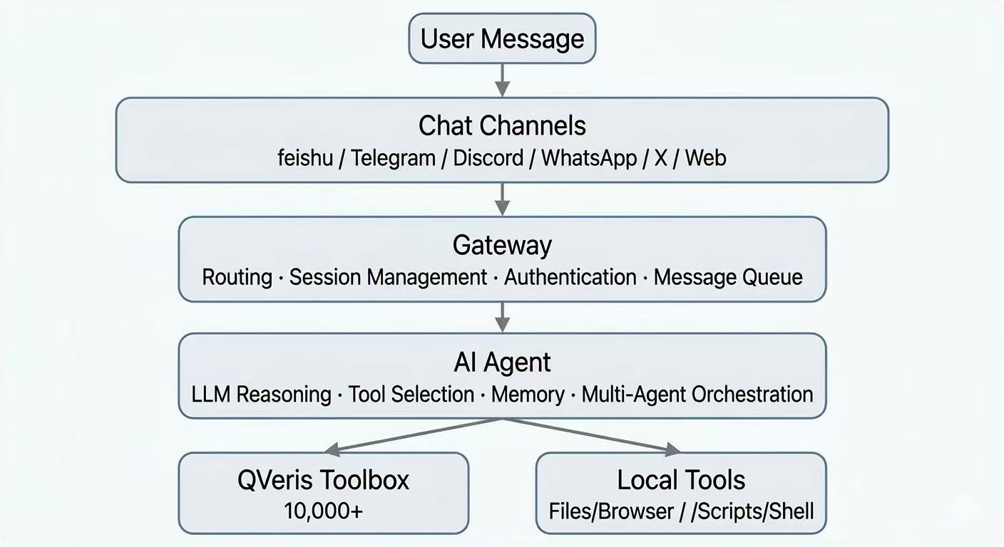 Built on OpenClaw's local-first architecture, powered by QVeris Universal Toolbox, connected across Feishu, Telegram, Discord, and more