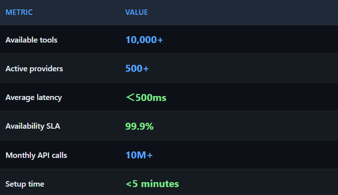 - Semantic search: Describe what you need in natural language (e.g., "get Beijing weather"), and the system finds the best tool from 10,000+ options across 500+ providers