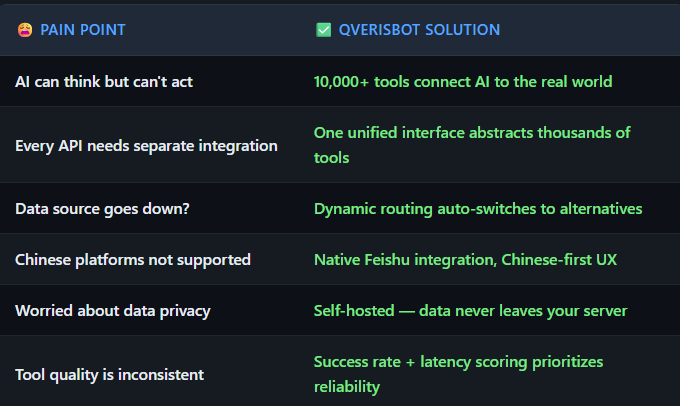 A typical AI assistant needs developers to manually find APIs, read docs, write adapters, and handle authentication — each tool integration takes 5-30 minutes. QVerisBot has the QVeris search-and-execute engine built in: